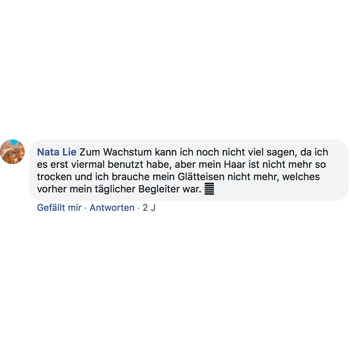 Die Wirkstoffe Sojaprotein, Vitamin B6, Keratin, Eierschalenextrakt und Chitin nähren die Haarfollikel, fördern das Haarwachstum, verbessern die natürliche Glätte und das natürliche Volumen und helfen, Spliss zu vermeiden.