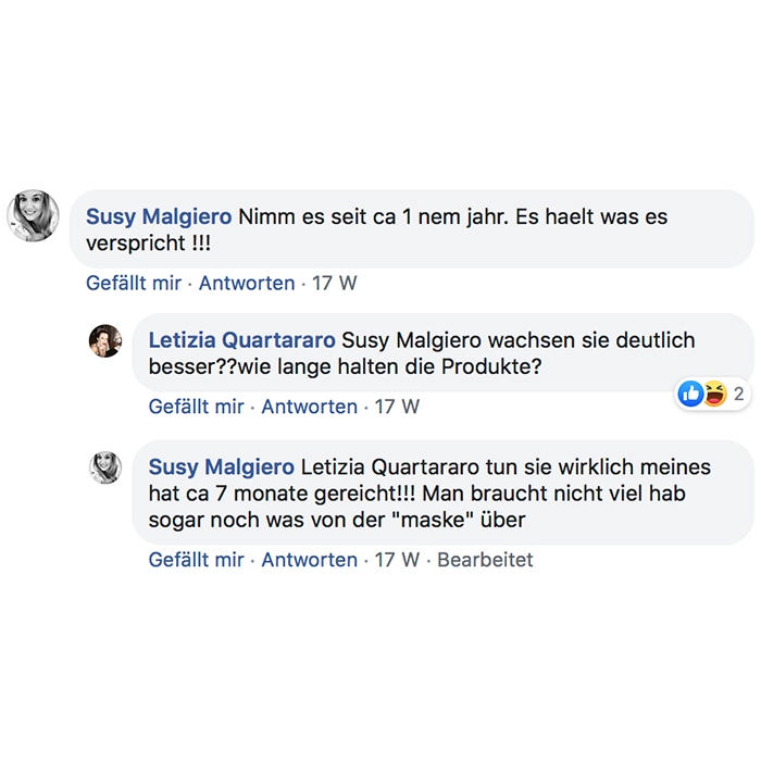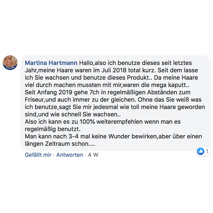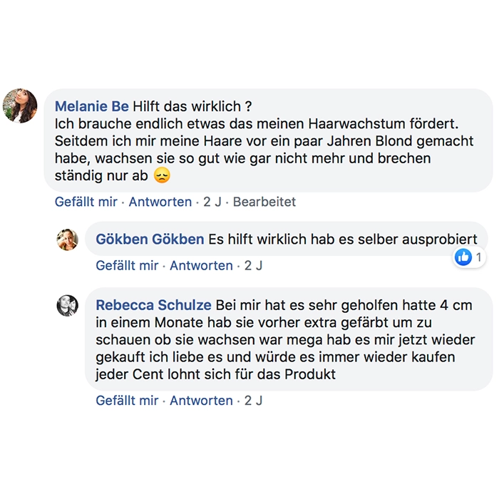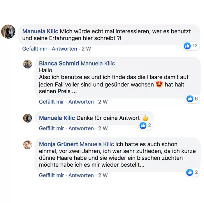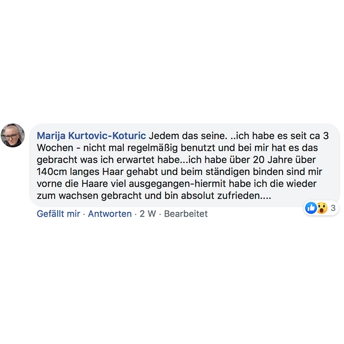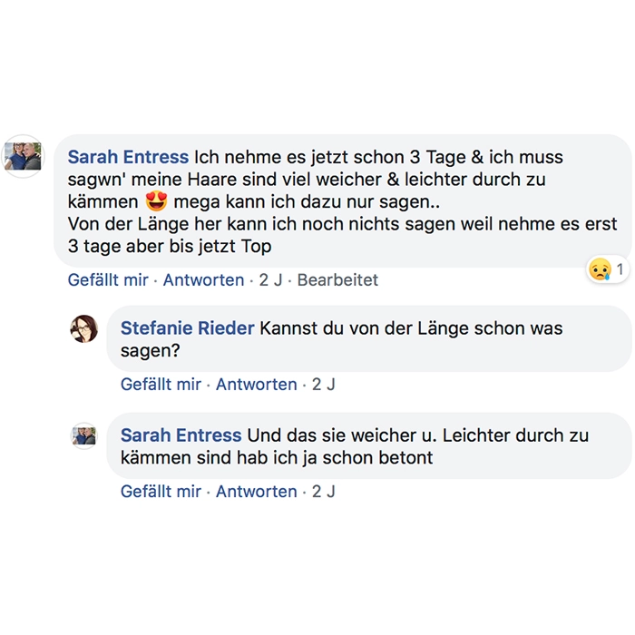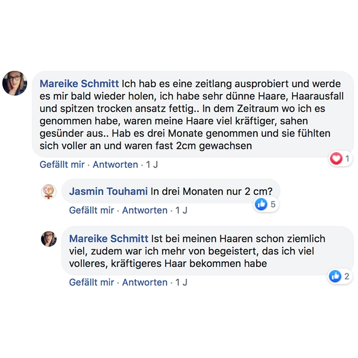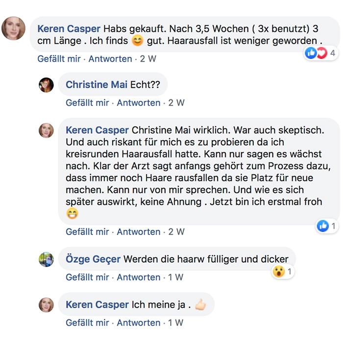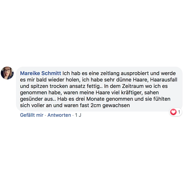 Ich nehme es seit ca. 2 Wochen und meine Haare fühlen sich kräftiger an, sehen fülliger aus und mein Haarausfall ist deutlich zurück gegangen! Auch sind die kleinen Härchen schneller gewachsen. Ich würde es mir wieder kaufen!
